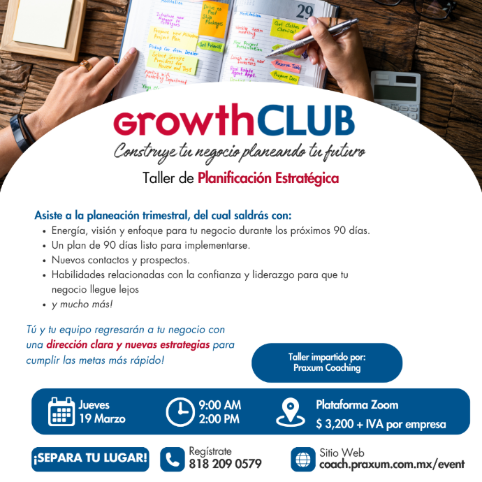 No dejes el futuro de tu empresa al azar. Los espacios son limitados para garantizar la atención personalizada en tu planeación. Únete a los miles de empresarios alrededor del mundo que usan el sistema GrowthCLUB para crecer.